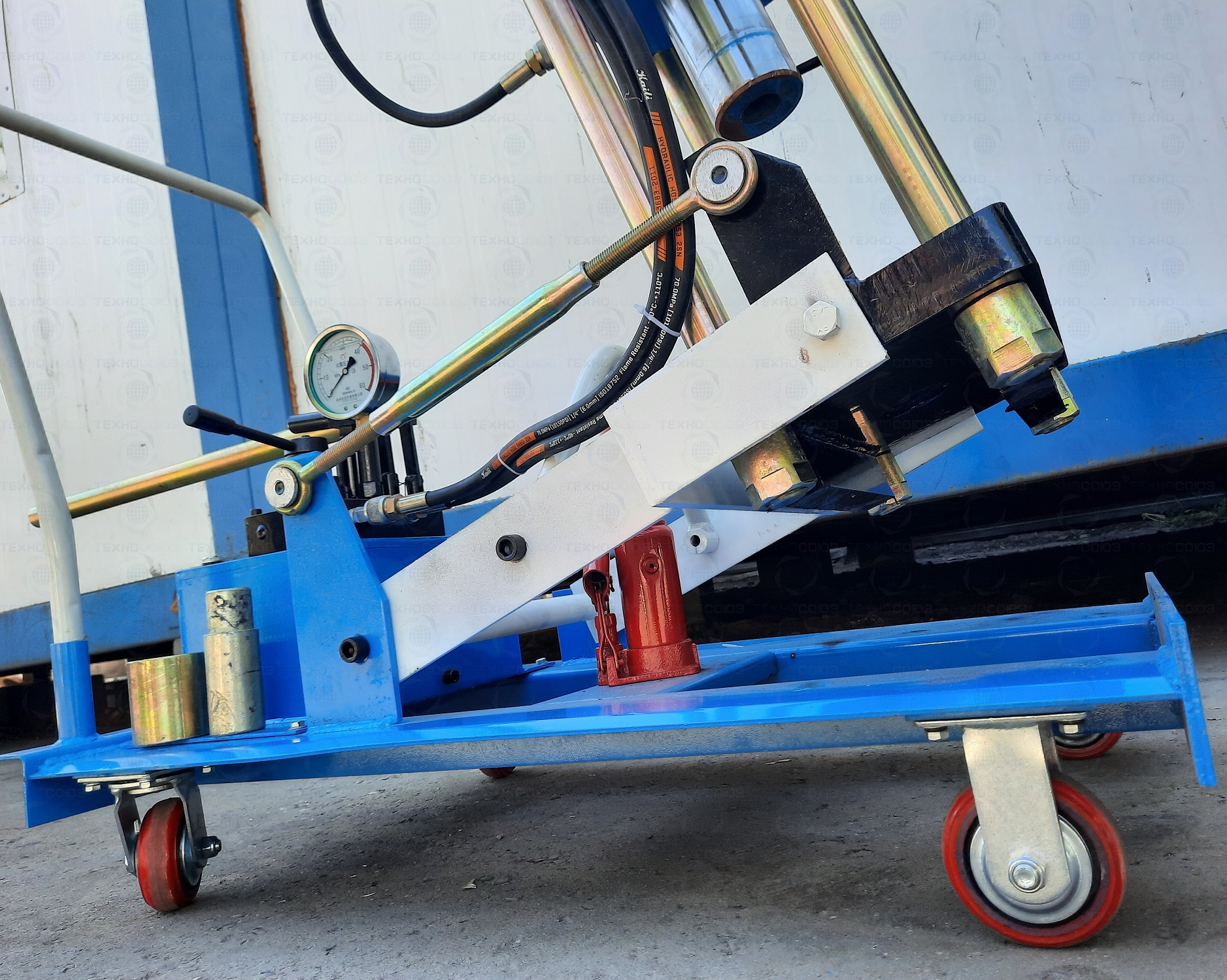 Мобильный. Позволяет работать под разными углами 1 человеку. Сокращает время ремонта. Для выпрессовки шкворней из поворотной цапфы. Для коммерческих и грузовых авто отечественного и импортного производства: MAN, MERSEDES, SCANIA, VOLVO, Корейские и Китайские автомобили, а также трактора, погрузчики, спецтехника. Пневмогидравлический привод - требуется подключение сжатого воздуха. Рабочее окно 400x320 мм. Усилие 150 тонн. Применяется для выпрессовки подшипников, валов, втулок, сайлентблоков.