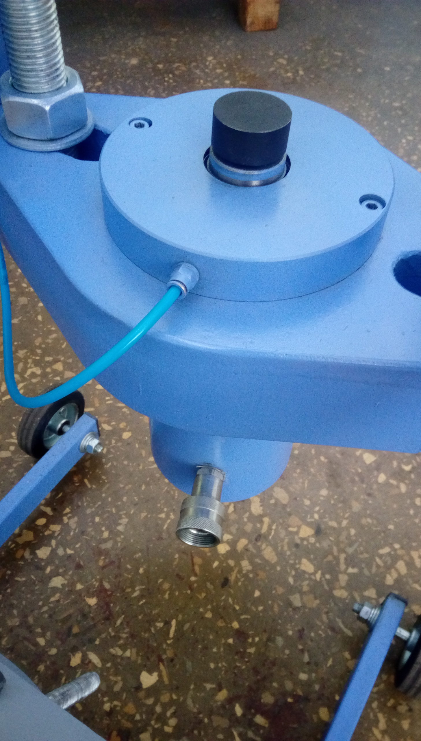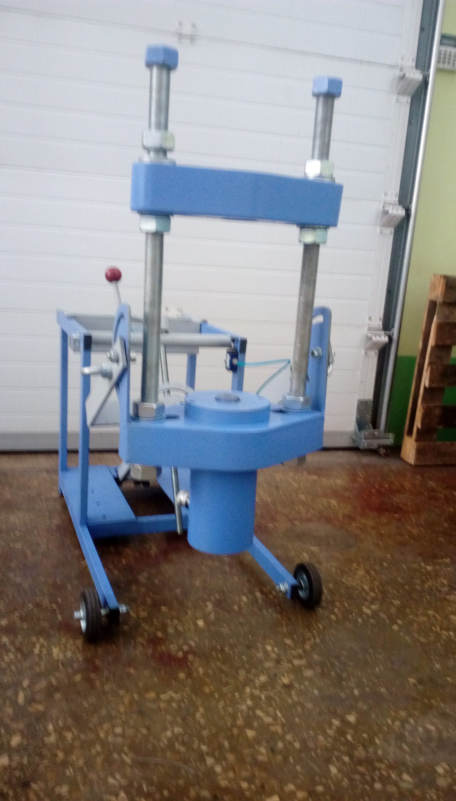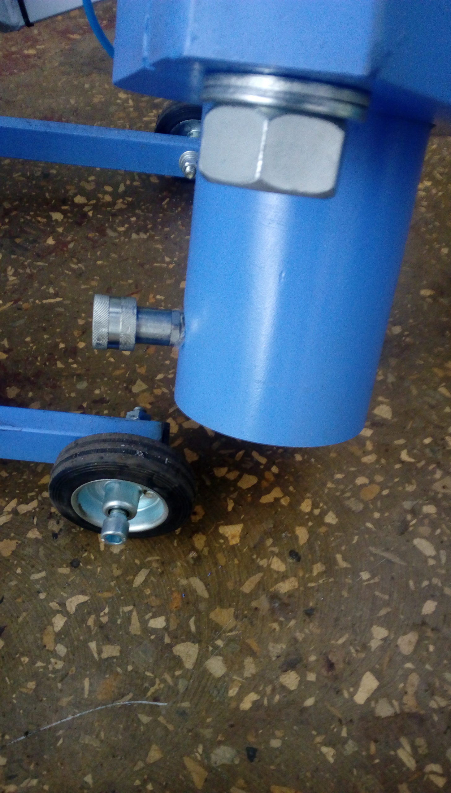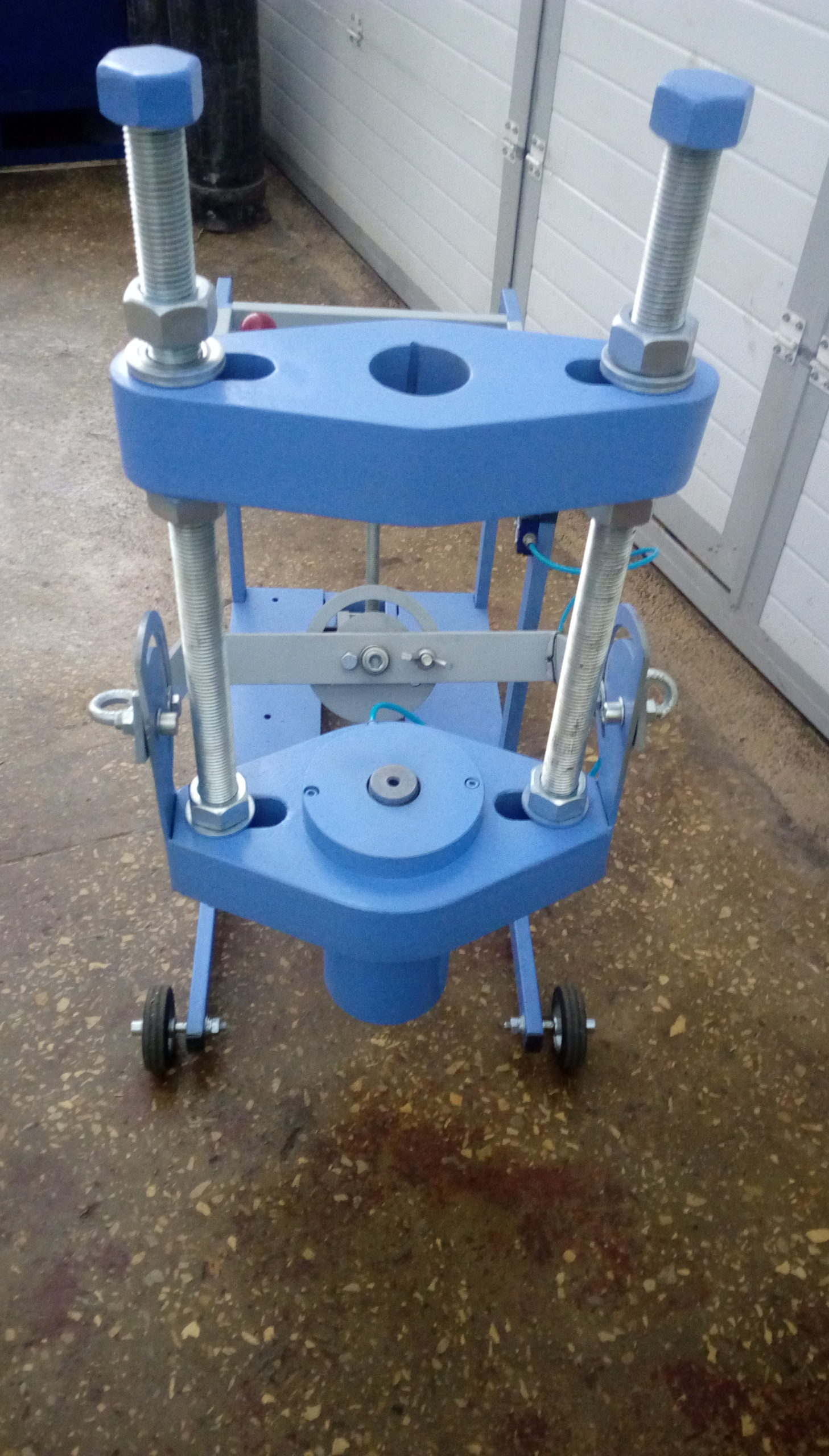 Одним из основных плюсов выпрессовщика ВШ70-200 с тележкой является возможность быстрой и безопасной работы. Шарнирно-закрепленная траверса с рабочим цилиндром позволяет поворачивать гидроцилиндр в любое требуемое положение. Использование винтовой тяги дает возможность устанавливать цилиндр под любым углом, что значительно увеличивает удобство в работе. Прорезиненные колесики диаметром 100 мм и поперечное перемещение колесиков до 10 мм обеспечивают легкость позиционирования выпрессовщика относительно шкворня.