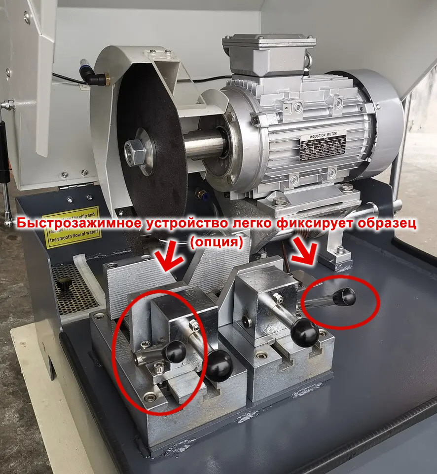 Станок оснащен системой охлаждения, для предотвращения перегрева образцов при резке и сжигания структуры металлографических и образцов из других материалов.