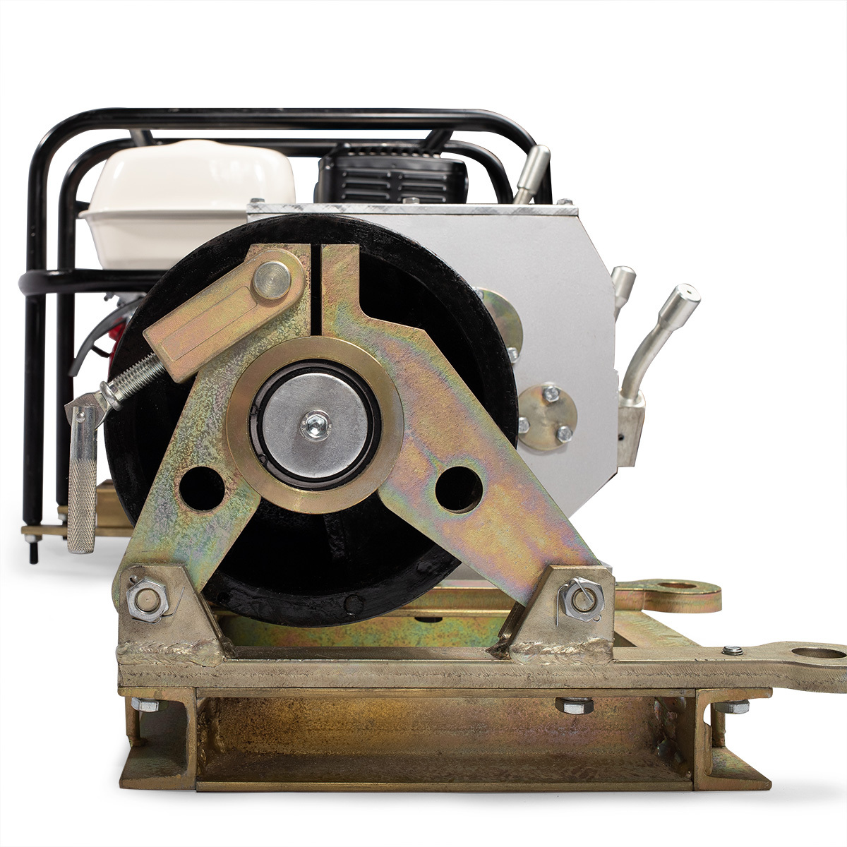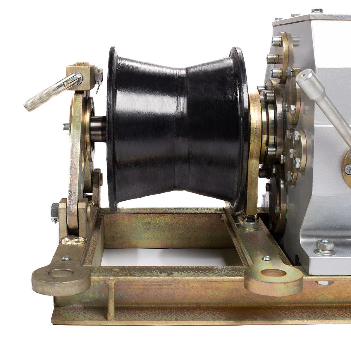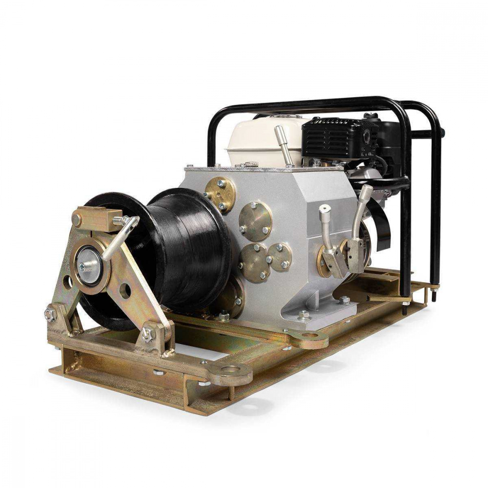 Лебедка тяговая автономная с бензиновым приводом и горизонтальным тяговым фрикционным барабаном предназначена для перемещения грузов по горизонтальной поверхности, протяжки кабеля и других видов работ в условиях отсутствия электроснабжения. Управление лебедкой осуществляется при помощи всего трех рычагов-ручек. Лебедка имеет правое и левое направление вращения вала переключаемые рычагом. Рычаг переключения скорости вращения позволяет осуществлять выбор скорости вращения вала – высокая либо низкая. Рычаг расцепителя служит для кратковременного разъединения двигателя от механизма редуктора и вновь его плавного соединения. Также, лебедка оборудована механизмом сцепления, предназначенным для передачи крутящего момента двигателя на вал редуктора лебедки, что значительно продлевает ее срок службы. Рама оснащена элементами для дополнительного закрепления на поверхности. Подходит для протяжки кабеля всех видов.