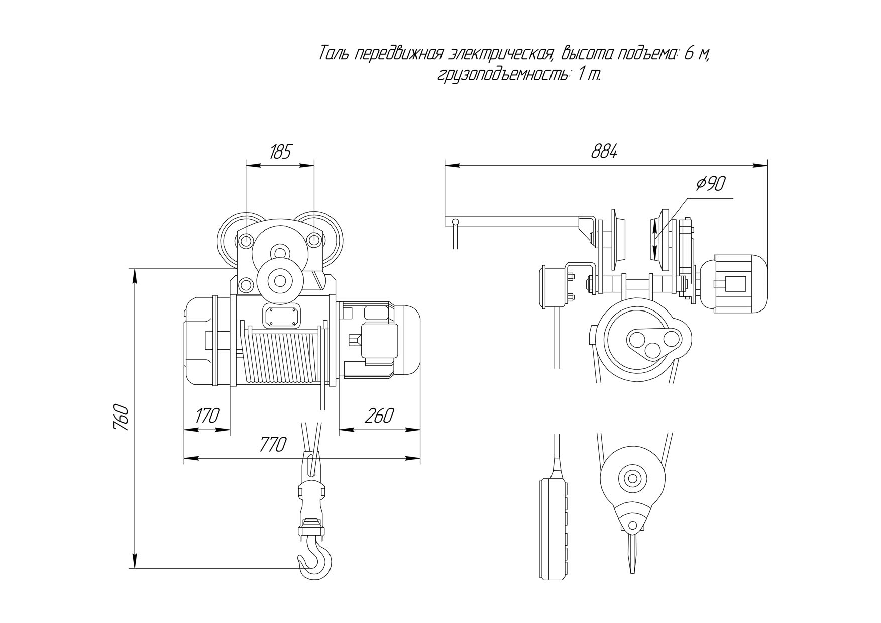 Передвижная электрическая канатная таль ТЭ 100 грузоподъемностью 1000кг оснащена кареткой передвижения с электроприводом. Таль предназначена для подъема, удержания и опускания различных грузов а также для горизонтального перемещения грузов вдоль монорельсового пути двутаврового профиля.