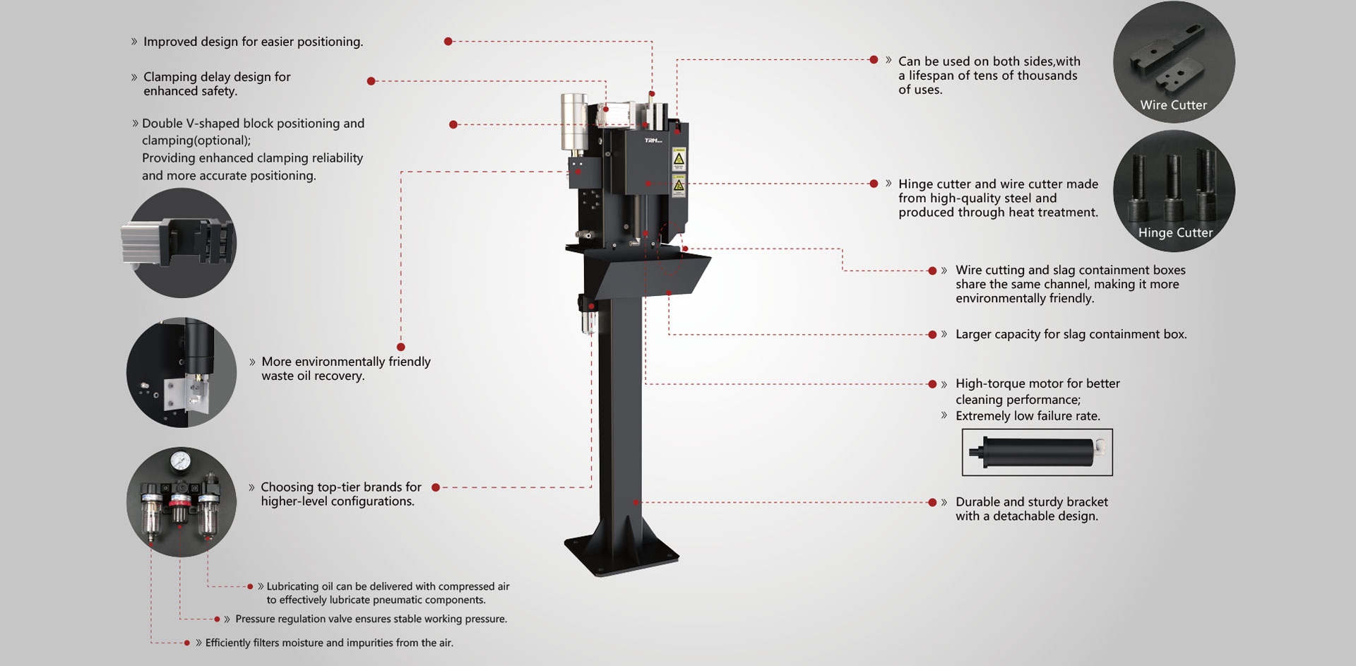 Пневматическая станция очистки SC221A(со стойкой для установки) предназначена для очистки сопел любых роботизированных MIG/MAG горелок от налипших брызг, их последующей обработки спреем против налипания брызг и откусывания лишней длины сварочной проволоки. Станция очистки управляется сварочным роботом. Фреза подбирается в зависимости от модели горелки, конфигурации сопла и контактного наконечника.