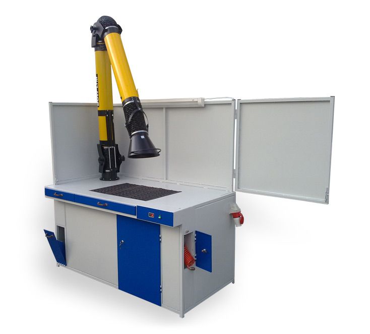 Цвет стола: корпус и экран серый по таблице RAL 7035, двери, ящики, колчан под электроды синий по таблице RAL 5010.