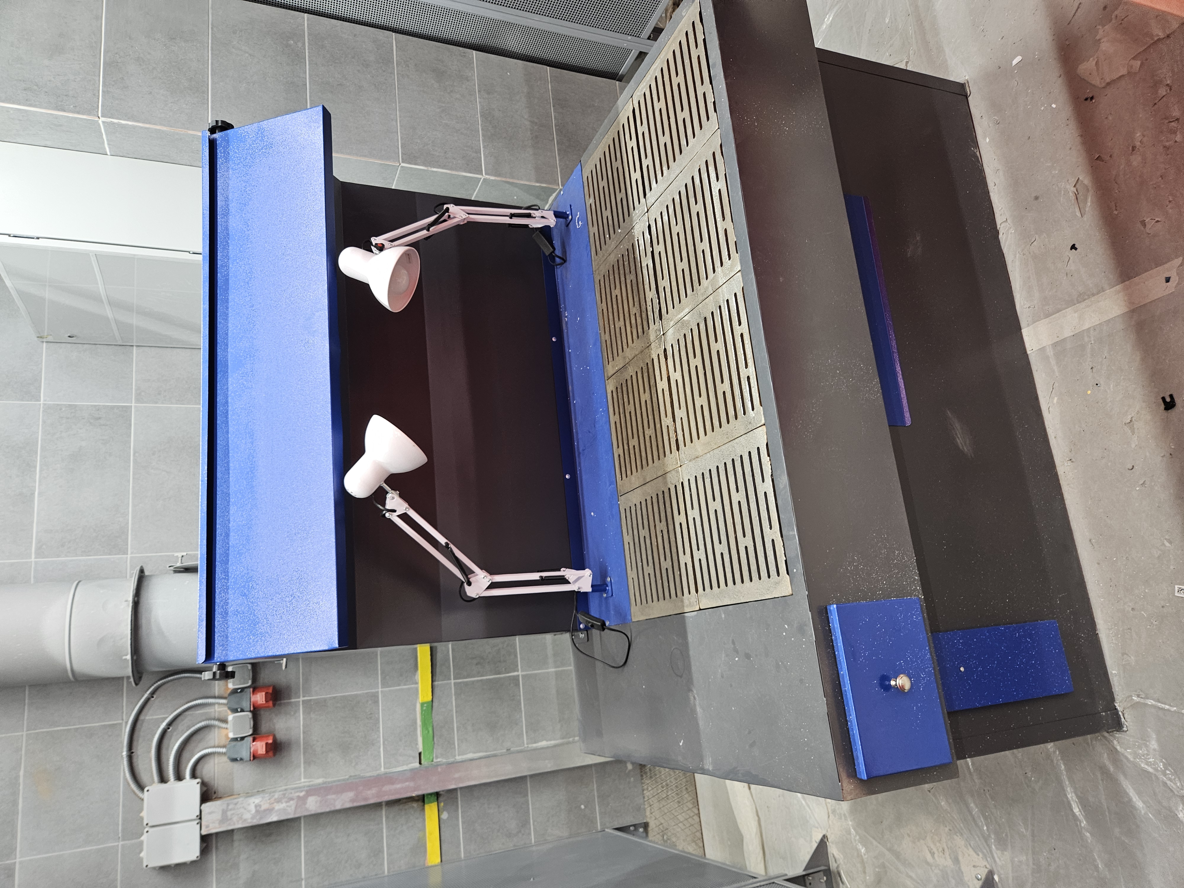 С лицевой стороны стола сварщика (сварочного поста) ССН-01-02 расположен выдвижной колчан для электродов, ящик для инструмента. Местное освещение стола сварщика ССН-01-02 производится двумя светильниками, установленными на столешнице.