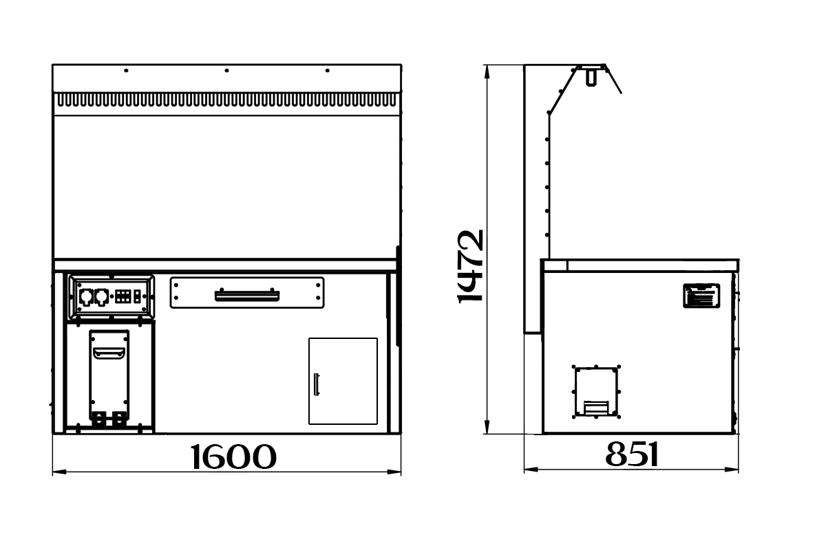 С лицевой стороны стола сварщика ССН-01 исп.2 расположен выдвижной ящик для инструмента. Местное освещение стола сварщика ССН-01 исп.2 производится светильником, установленным в верхней части вытяжного зонта. Пульт управления вентилятором расположен справа под столешницей.