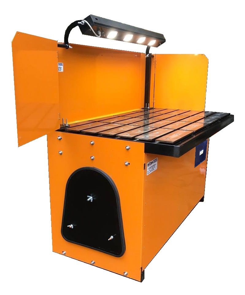 Стол оборудован съемным экраном, причем боковые стенки экрана, имеющие гибкие соединения с центральной частью экрана, могут раскладываться, образуя единую плоскость с центральным экраном, или, наоборот, складываться к центру стола. Сверху, на защитном экране расположен светильник, обеспечивающий необходимую яркость для комфортной работы сварщика.
