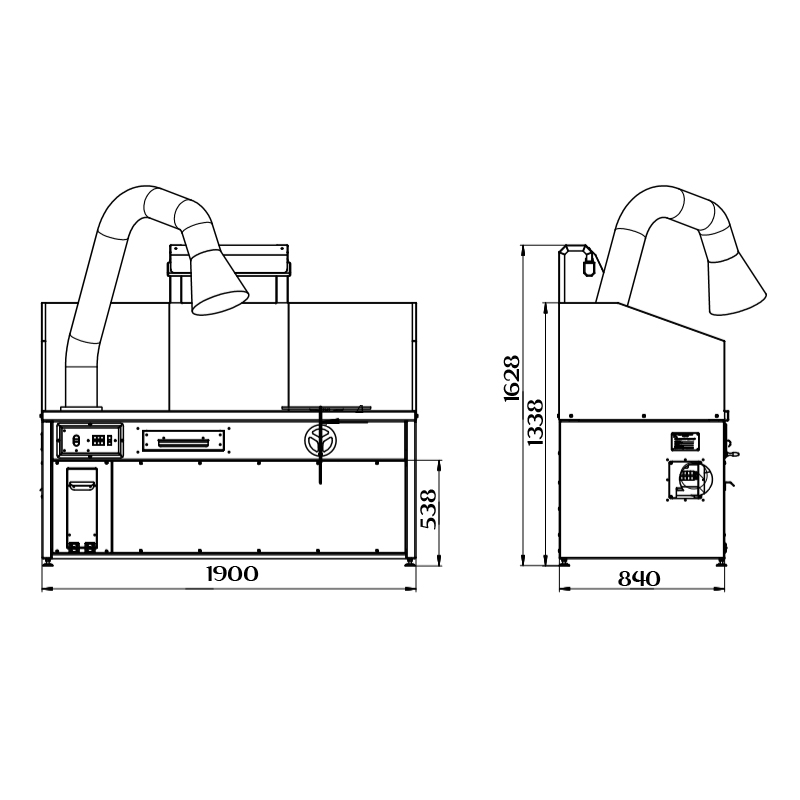 Воздушно-газовая смесь, удаляемая с поверхности стола через ПВУ, проходит через искрогаситель и воздуховод, подсоединенный к кожуху фильтра, через фильтрующую кассету, вентилятор и уже в очищенном состоянии выбрасывается через левую боковую стенку стола. Перемещаемый воздушный поток должен иметь температуру, не превышающую +70 градусов, содержать взрывоопасных смесей.