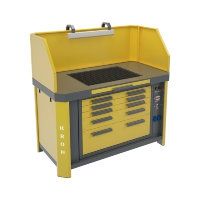 Стол сварщика (сварочный пост) ССУ-02 имеет две тумбы для инструмента и вспомогательного оборудования с полками, тумбу с четырьмя выдвижными ящиками с центральным замком, а также специальный выдвижной колчан для электродов.