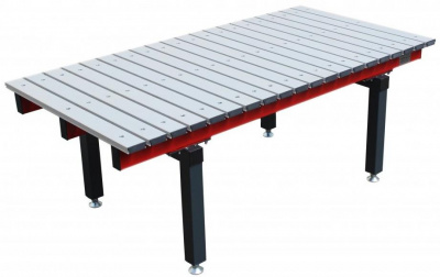 Сварочный стол ССМ-01-02 исп.2 состоит из сварных деталей рамы на 4-х стойках и 16-ти цельнолитых алюминиево-медных балок с Т-образным пазом, выполненным методом фрезерования, постоянного сечения 95х30 мм длиной 1200 мм, образующих столешницу.