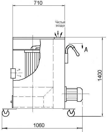 Фильтр состоит из корпуса с входным патрубком, снабжен колёсами для перемещения по полу цеха. На корпусе закреплено воздухоприёмное устройство. Внутри корпуса по ходу воздушного потока установлен отбойник, для предотвращения попадания крупных частиц, окалины и искр на основной фильтрующий элемент картриджного типа. Внутри фильтрующего элемента расположена система регенерации, а её привод на крышке фильтрующего элемента. Включение электродвигателя системы регенерации осуществляется автоматически через (50-60) сек. после включения вентилятора.
