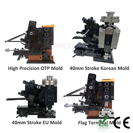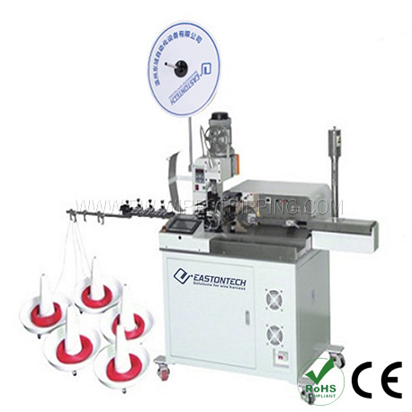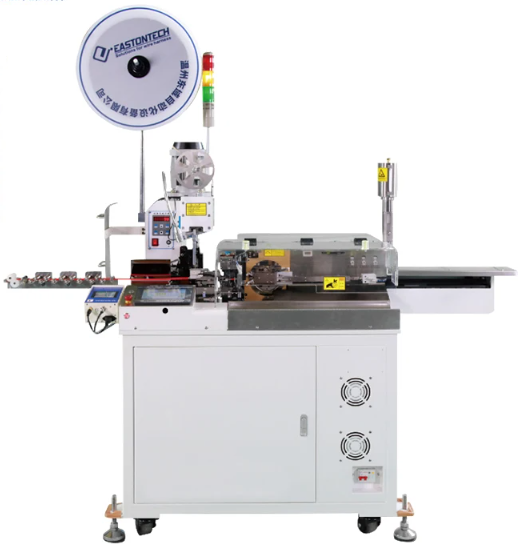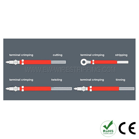 Автоматический станок для обжима проводов EW-22G – это машина с цифровым управлением, которая может в непрерывном режиме обрабатывать сразу четыре проводника AWG 18…32 (может быть настроена по индивидуальному заказу под необходимый размер сечения). Непосредственная задача – это высокоскоростное снятие изоляции для последующего обжима клеммами первых концов и лужения вторых концов. Клеммы подаются из разматывающейся бобины, дозаправка для лужения выполняется автоматически. Управление – с помощью цветного сенсорного экрана. Монитор для контроля силы обжима – опция.